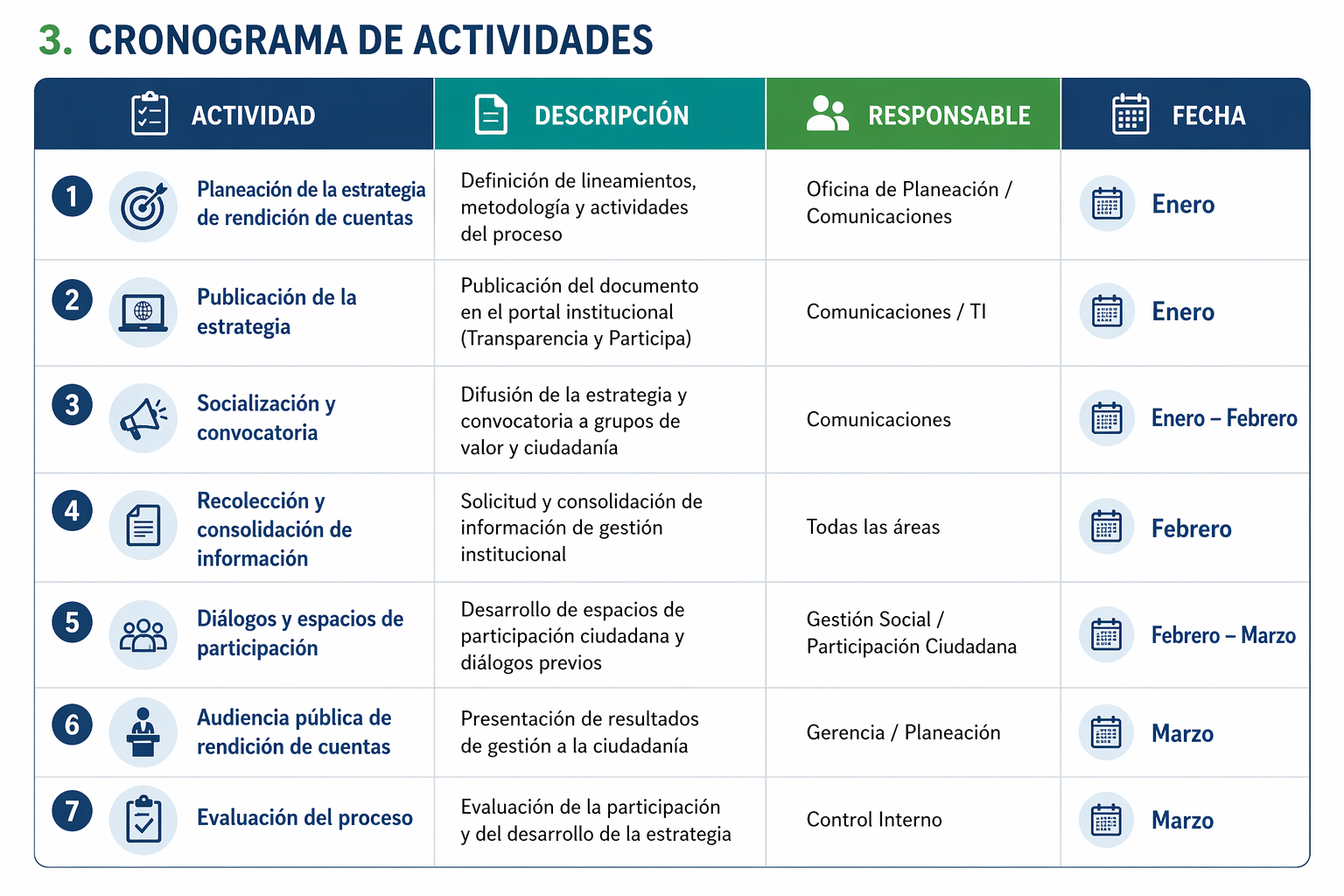 El seguimiento al cumplimiento del cronograma estará a cargo de la Oficina de Control Interno, garantizando la ejecución de las actividades en los tiempos establecidos.